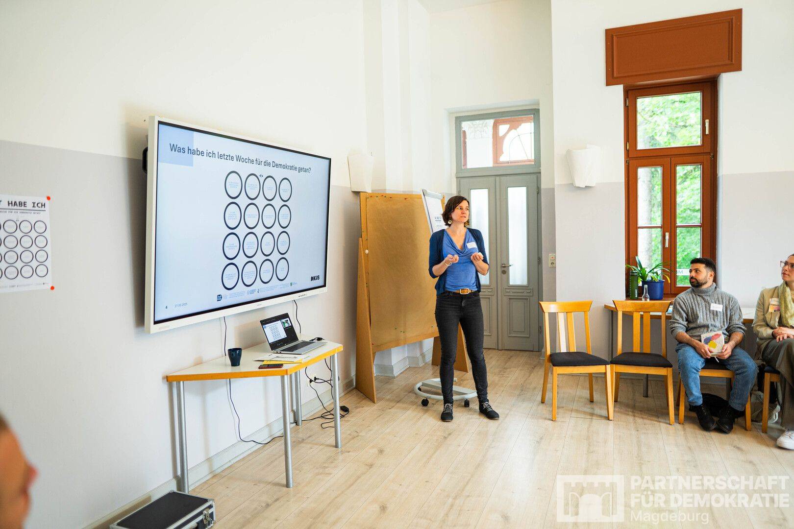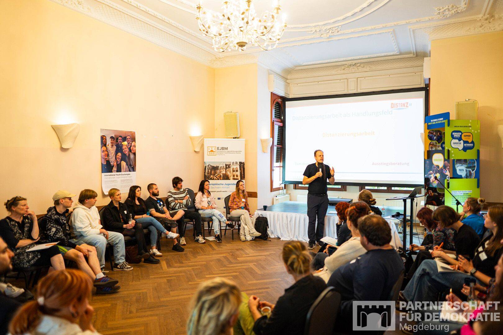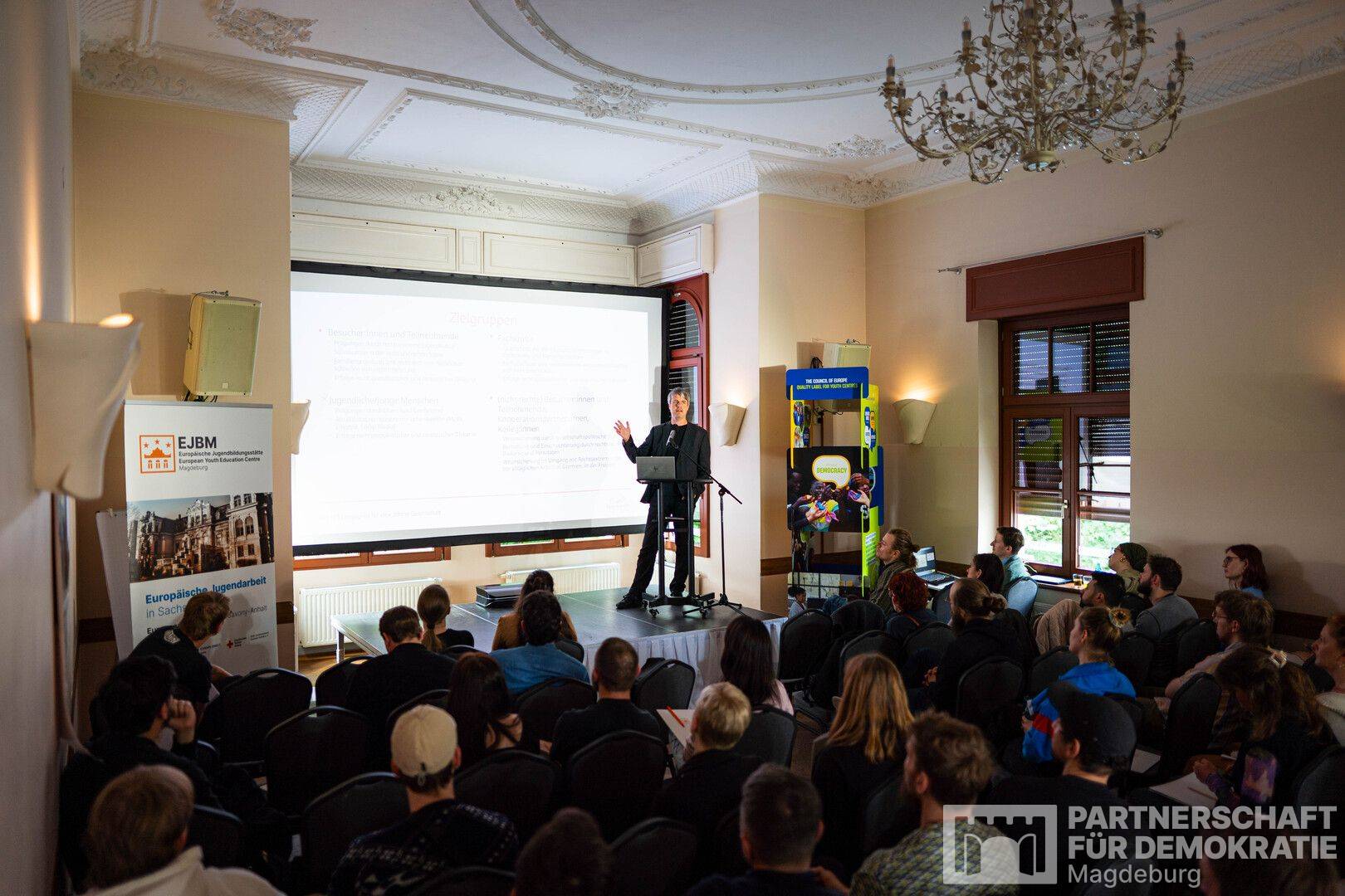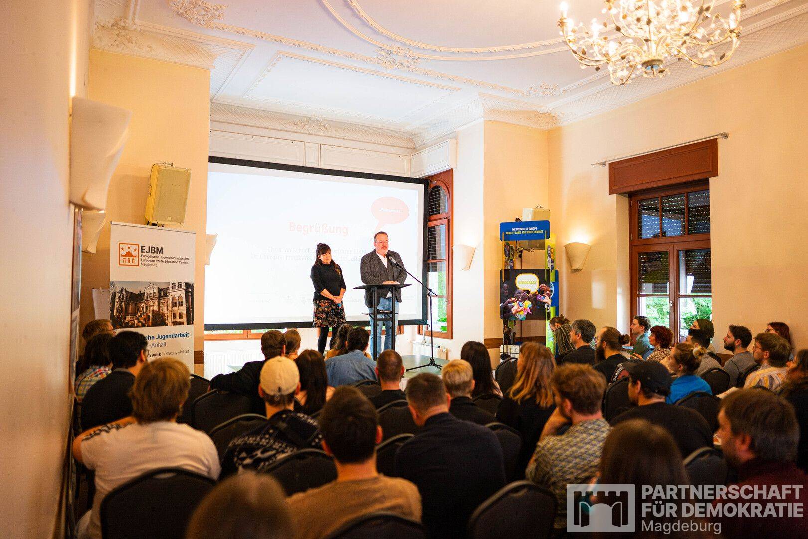 Nach der Begrüßung durch Christian Scharf (Leiter der EJBM) und Dr. Christina Langhans (Pädagogische Leitung EJBM) wurde die neue Koordinierungs- und Fachstelle der Partnerschaft für Demokratie Magdeburg vorgestellt – inklusive Infos zu aktuellen Förderschwerpunkten und zur Projektbeantragung.